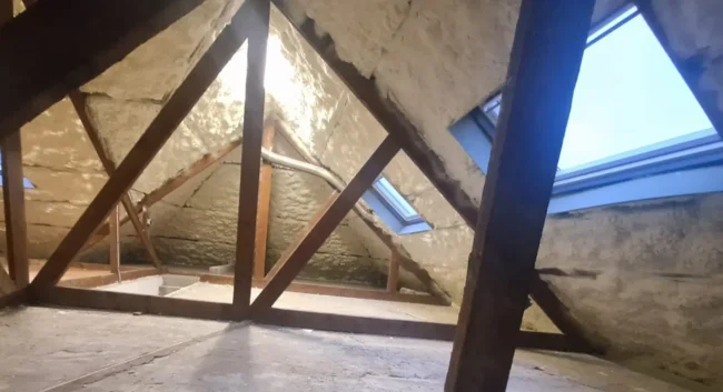 Isolatie van het dak met volledige afwerking en zoldervloer van een oud landhuis in Zaventem