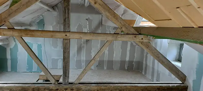 Daarna plaatsten we Gyproc-platen: vochtwerende in natte ruimtes en standaard in de overige kamers. Deze dubbele aanpak zorgt voor een nette, duurzame afwerking die perfect is afgestemd op elke ruimte.