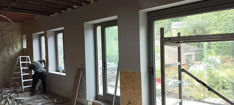 Plaatsing van Gyproc-platen (vochtwerend en standaard) – 246 m²