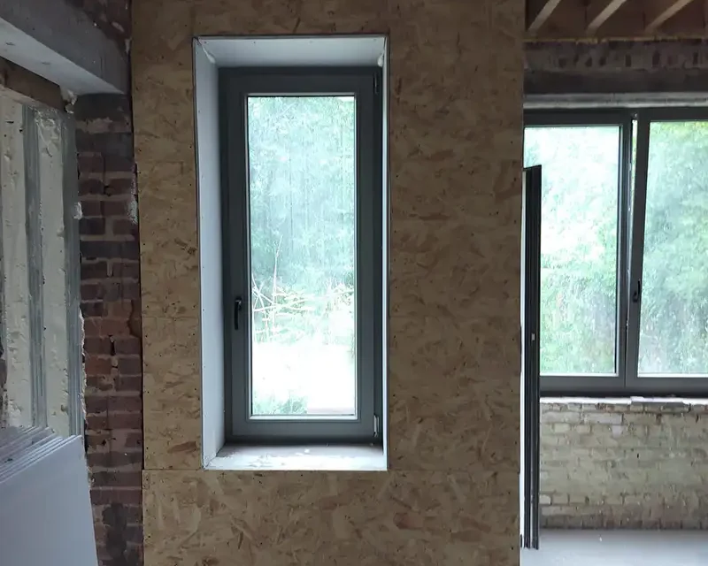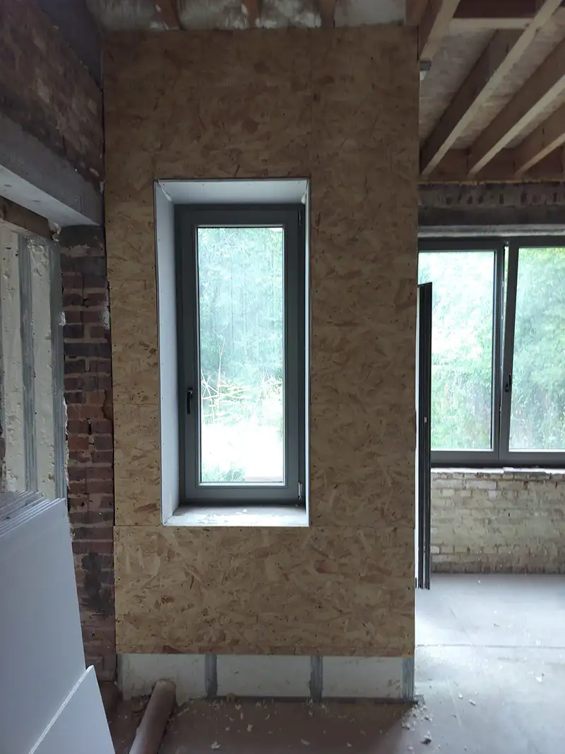 We installeerden OSB-panelen op alle buitenmuren. Dit materiaal versterkt de structuur, verbetert de luchtdichtheid en vormt een stabiele, robuuste basis voor de volgende afwerkingen.