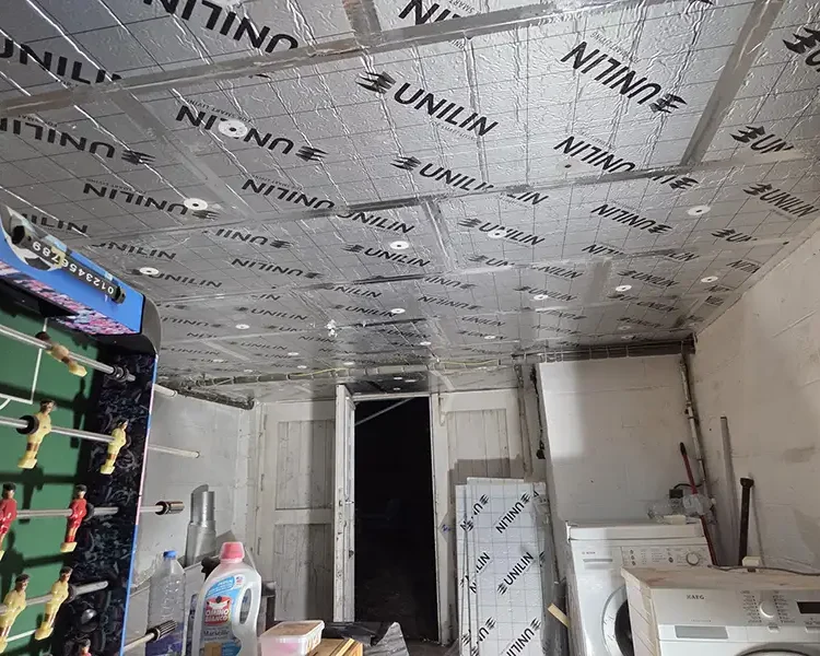 Dit keer betrof het de isolatie van alle binnenmuren en de plafonds van het gelijkvloers. De klant had zelf alle voorbereidende werken uitgevoerd zoals het plaatsen van de structuur in Metalstud en het klaarleggen van alle leidingen.