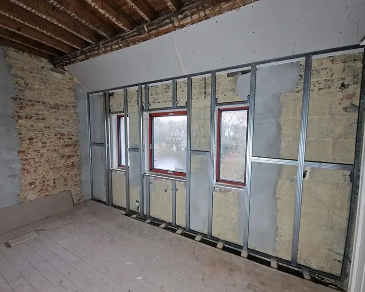 Eerst werd op 10 cm van de muur een structuur in Metalstud geplaatst.