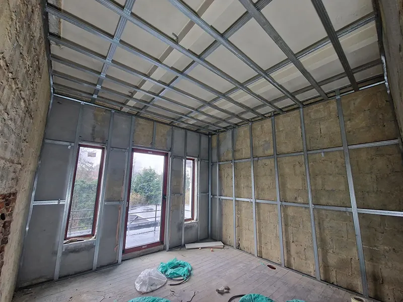 Eerst werd op 10 cm van de muur een structuur in Metalstud geplaatst.