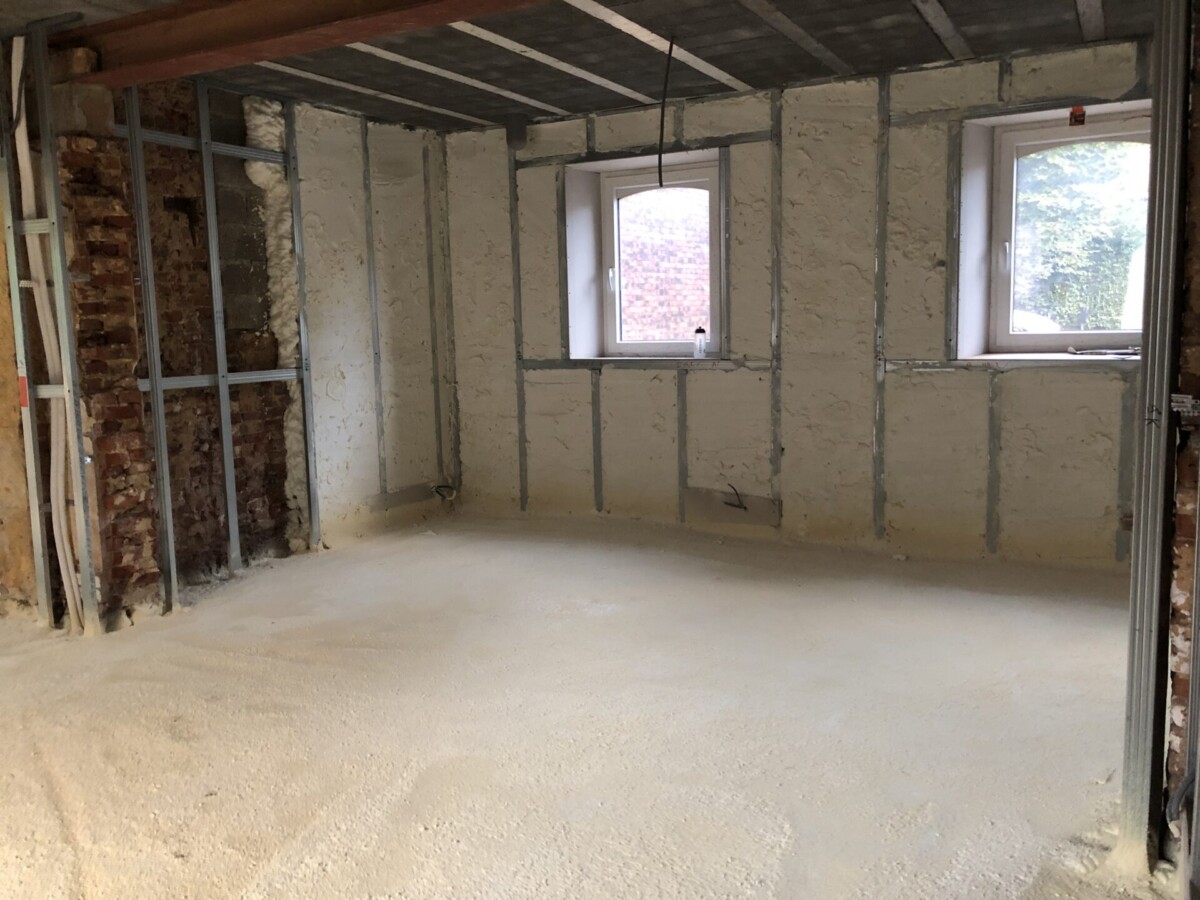 Nous sommes intervenus dans le cadre d’une rénovation totale. Le client avait pris soin de préparer chaque étape : remplacement de la couverture de toit, mise à nu des murs avec pose d’une ossature Metalstud, et décaissement du sol de 30 cm et coulage d’une dalle de béton armé destinée à recevoir l’isolation, la chape et la finition.