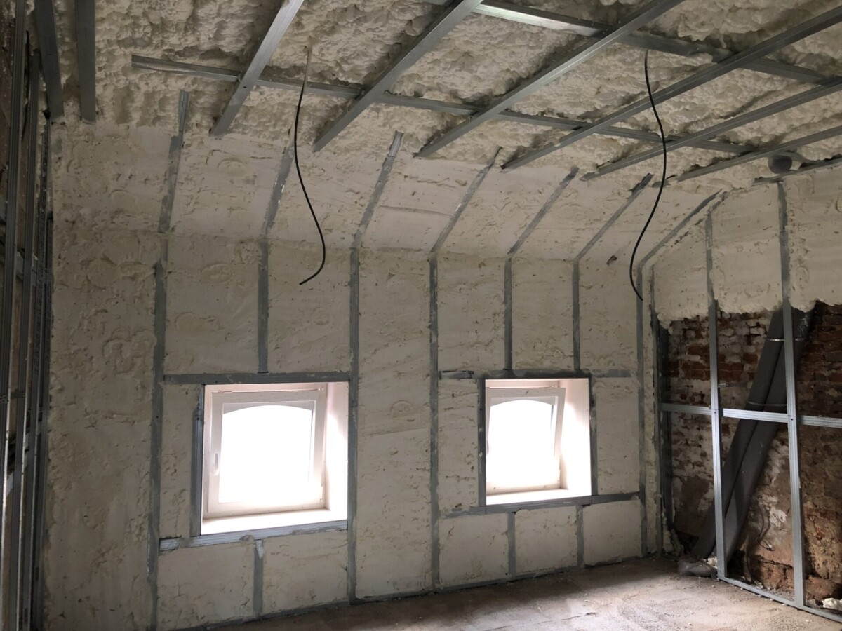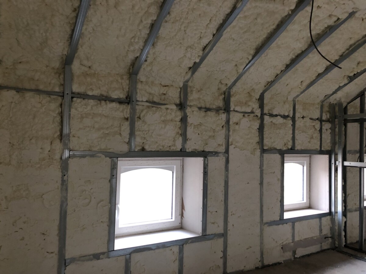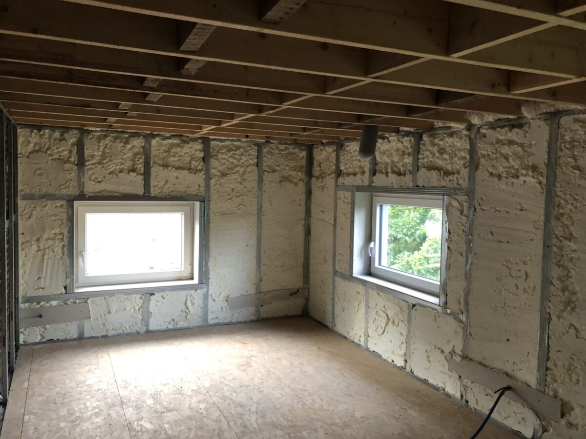 Nous avons projeté 18 cm de mousse ICYNENE Lite+ en toiture et 15 cm sur les murs. Ce matériau à cellules ouvertes est étanche à l’air, perméable à la vapeur d’eau et ne nécessite donc pas la pose d’un pare-vapeur supplémentaire.