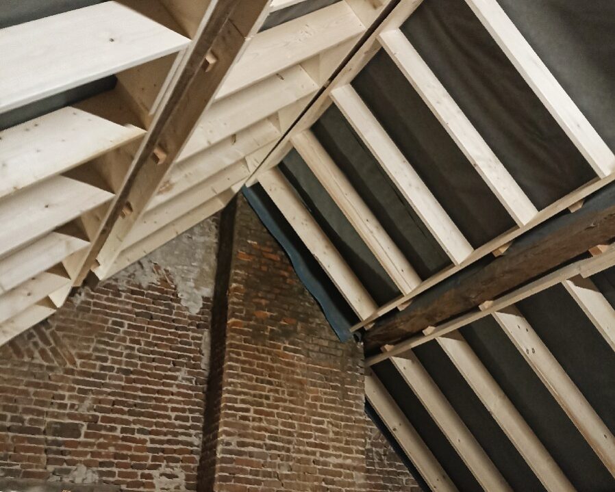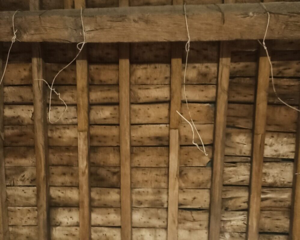 Quand nous avons visité ce chantier, nous avons constaté que la toiture était encore en bonne état et qu’il s’agissait d’une sous toiture d’époque, constitué de planches en bois, espacées les une des autres. Il était donc important, avant notre intervention de projection, qu’une toile soit posée, pour servir de support, afin que la mousse ne soit pas en contact avec les tuiles, ni les planches. Le client a donc au préalable tendu une toile hautement perméable à la vapeur d’eau, sur les chevrons.