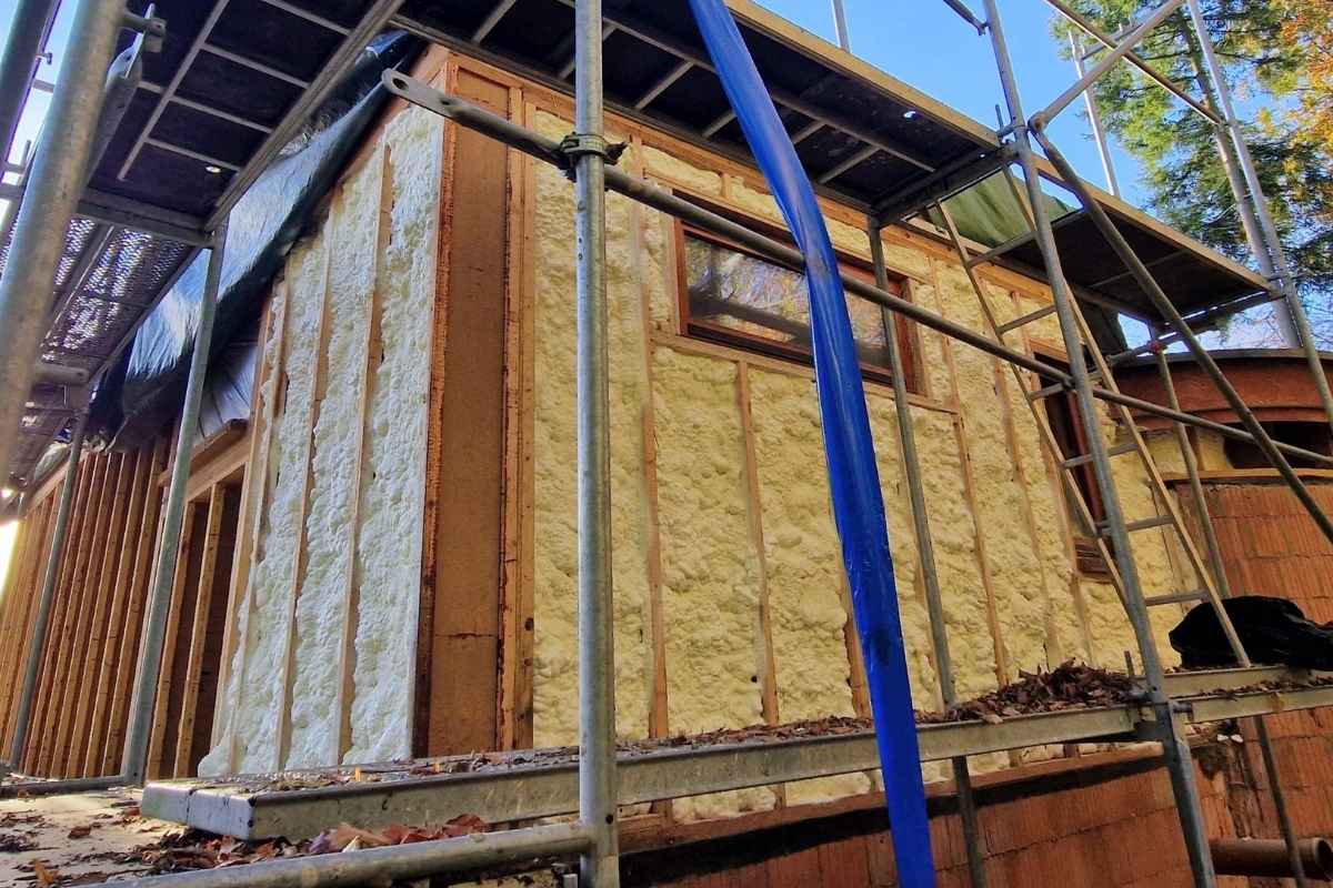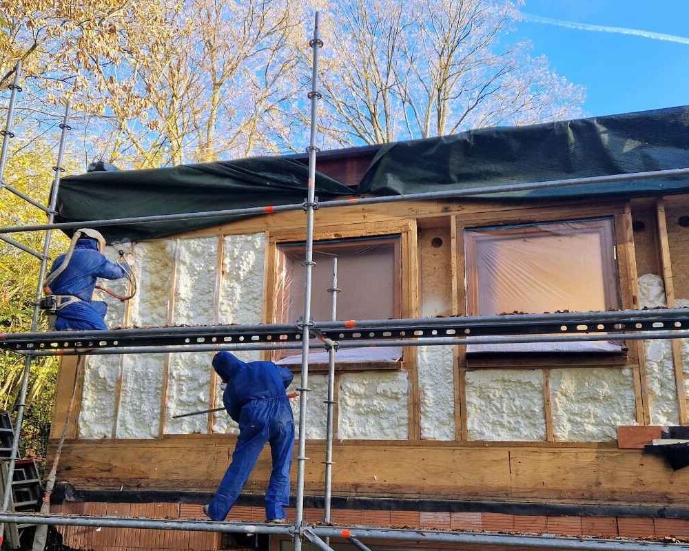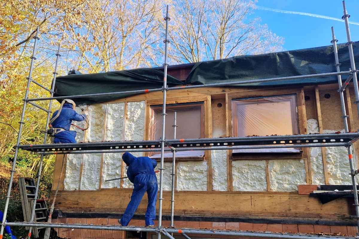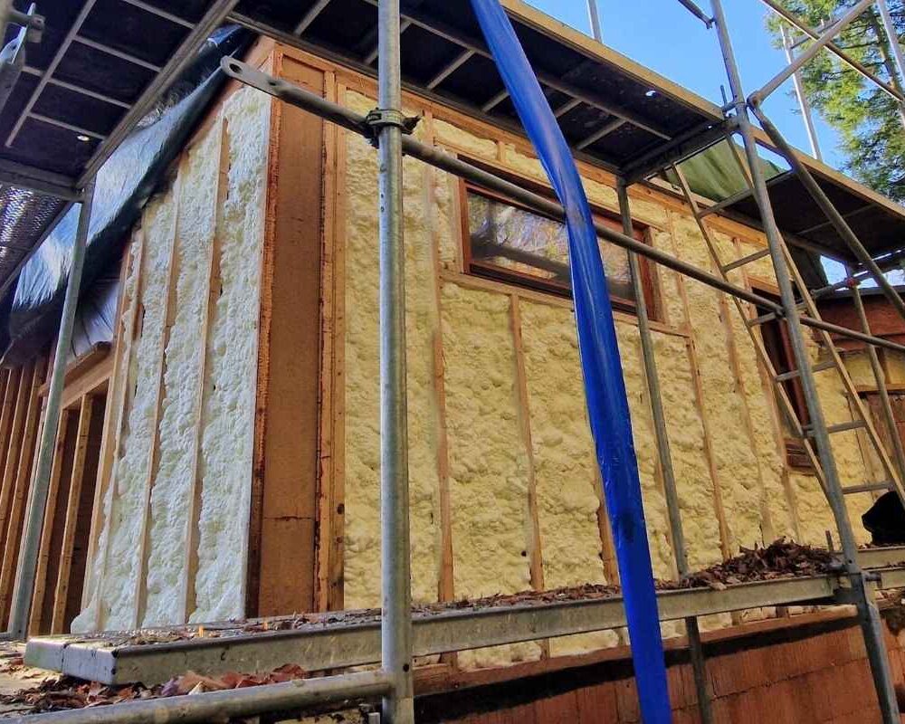 Le chantier consistait à isoler les murs par l’extérieur, entre une structure en bois, avec une mise en œuvre garantissant une isolation uniforme sur toute la surface. Cette logique rejoint les avantages de l’isolation projetée : une application rapide, homogène et efficace, même sur des zones complexes.
