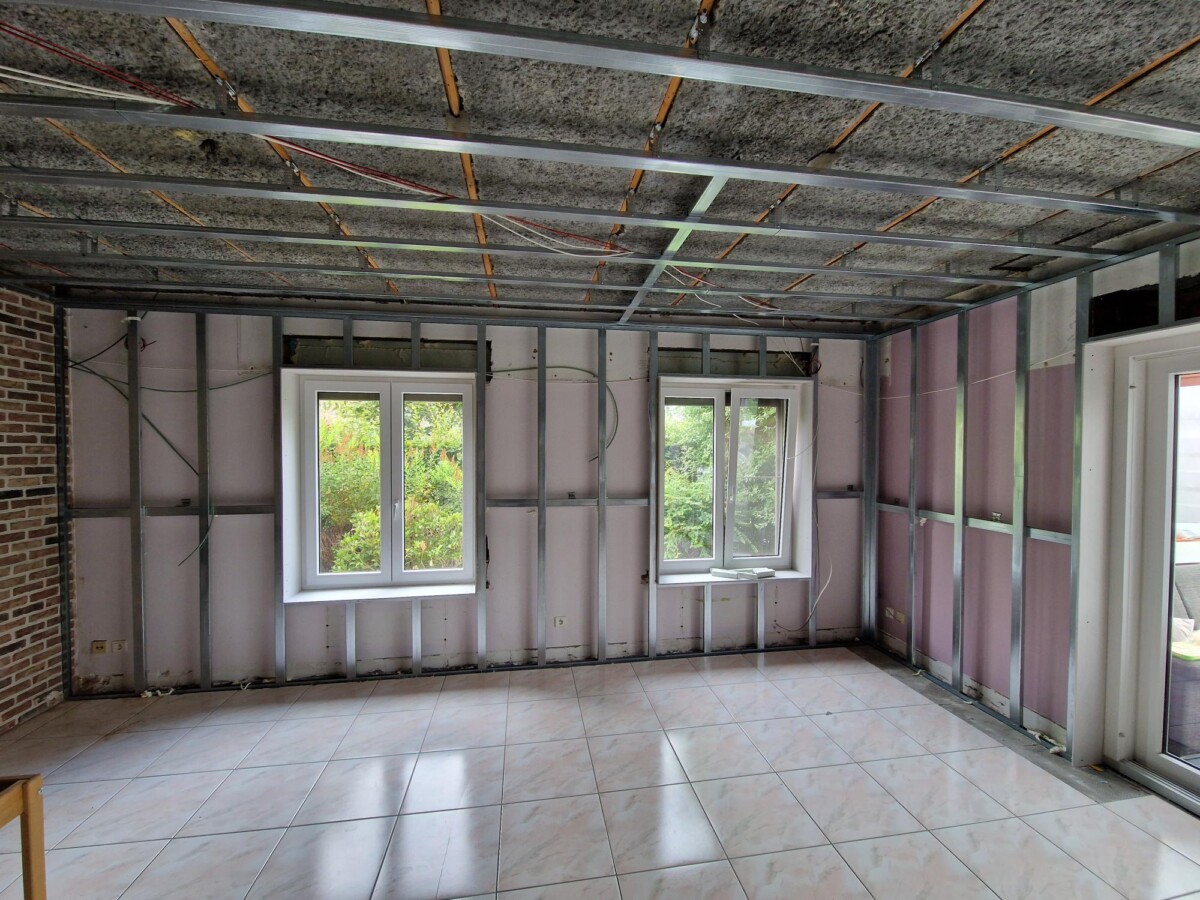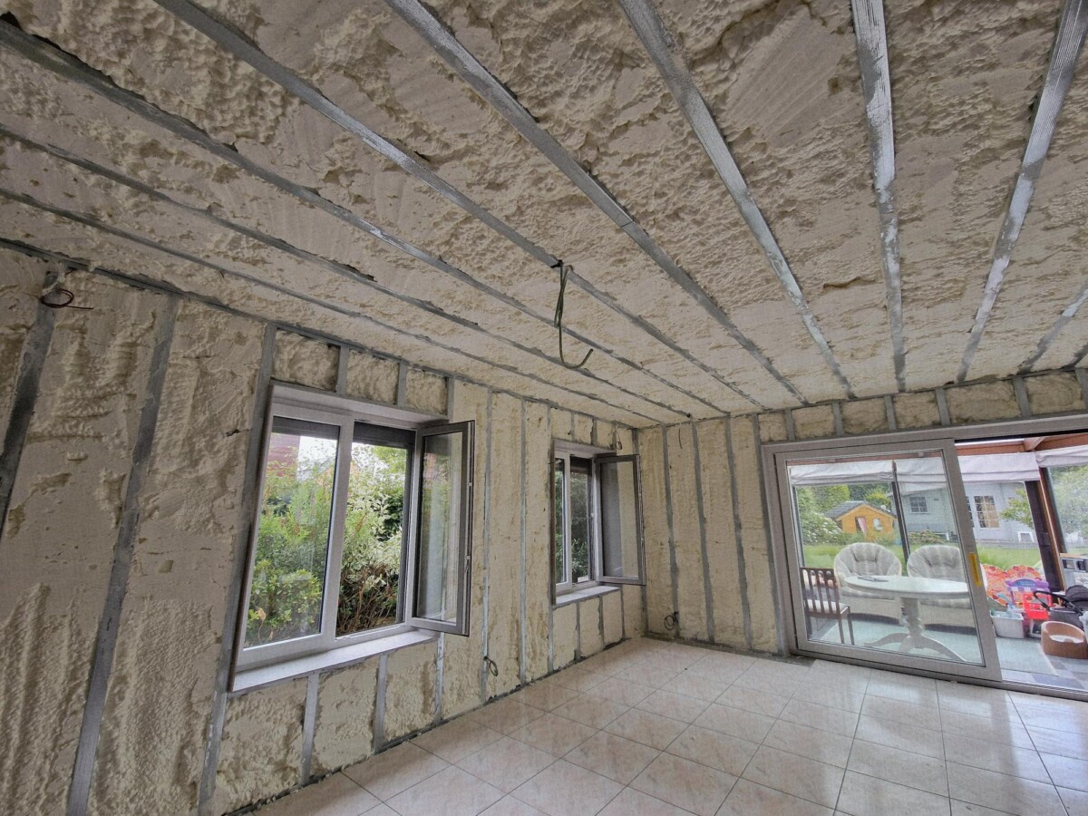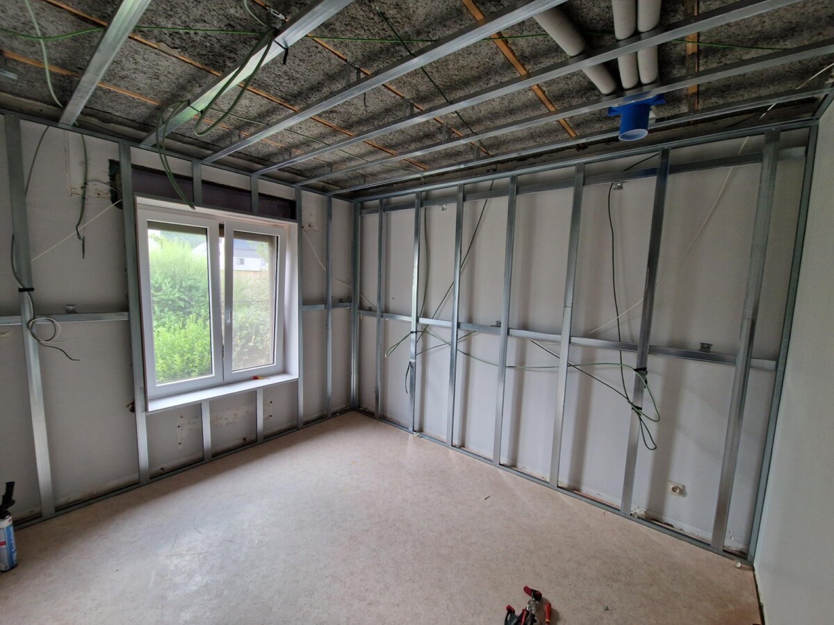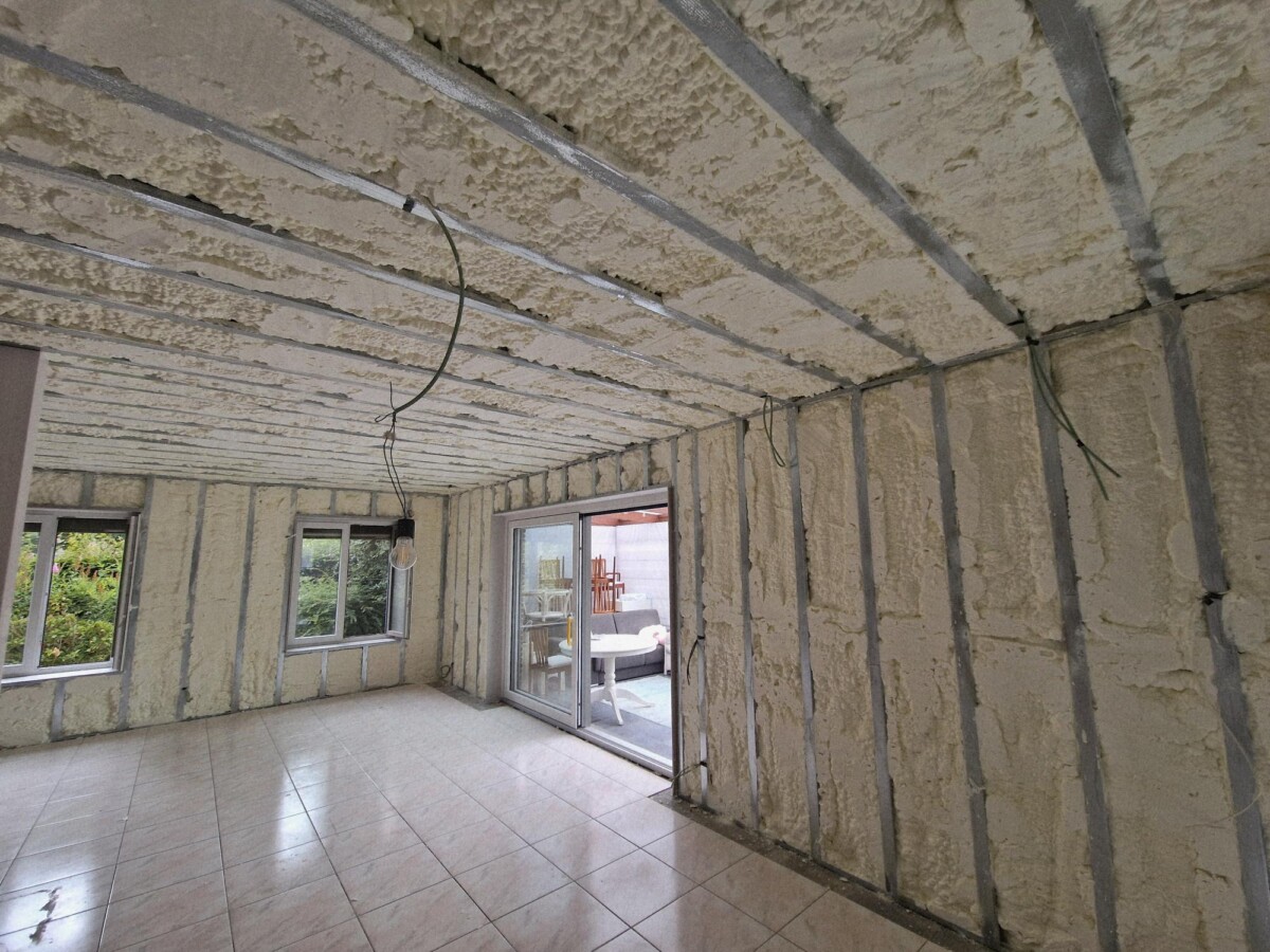 Pour cette nouvelle phase, il s’agissait d’isoler tous les murs intérieurs et les plafonds du rez-de-chaussée. Le client avait lui-même posé la structure Metalstud et préparé les conduites, ce qui nous a permis d’intervenir rapidement et efficacement.