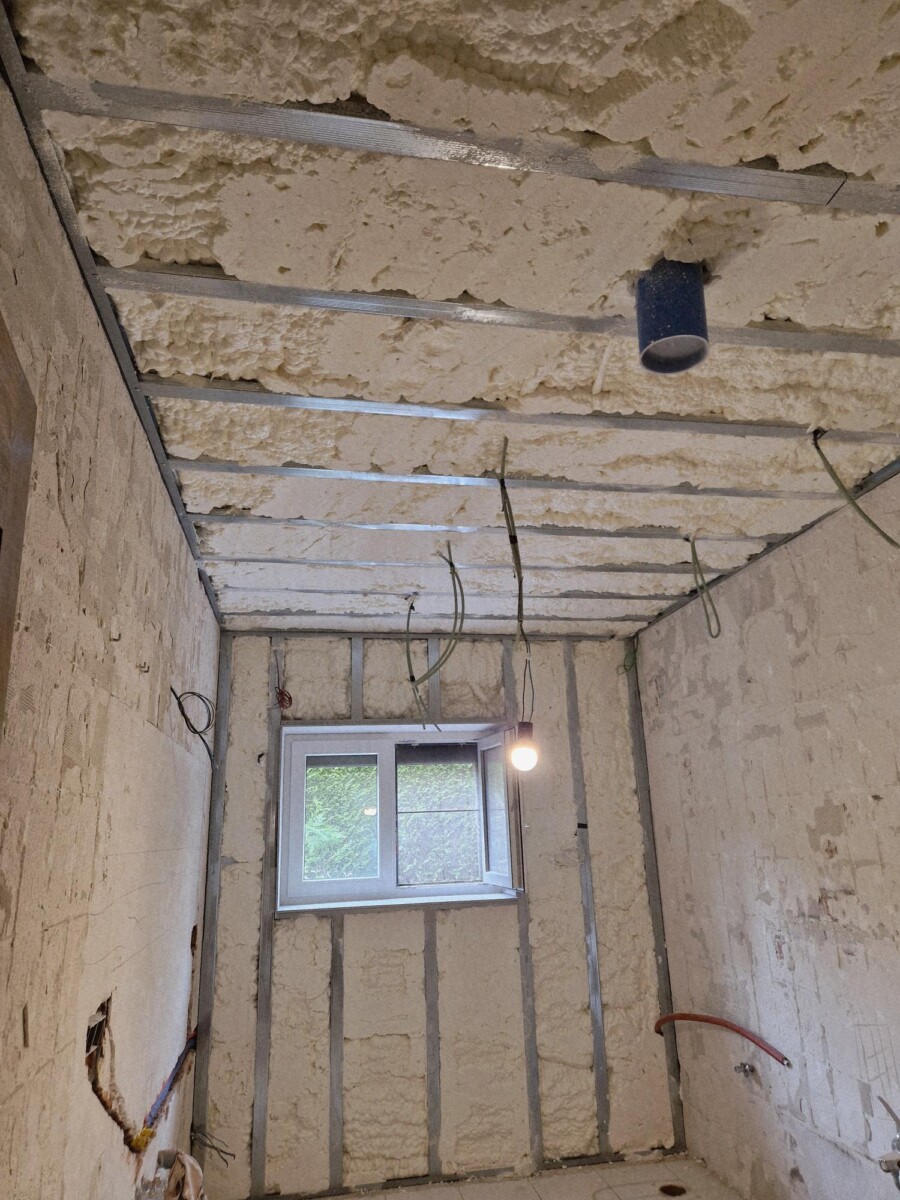 Nous avons projeté 8 cm de mousse en brut sur 100 m² de murs et 120 m² de plafonds. Là où la mousse dépassait légèrement la structure métallique, nous avons procédé à un découpage précis, facilitant ainsi la pose ultérieure de l’OSB et du Gyproc.
