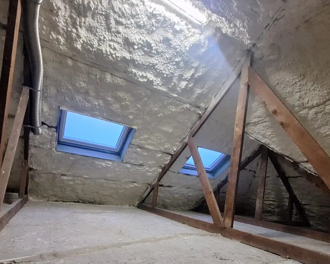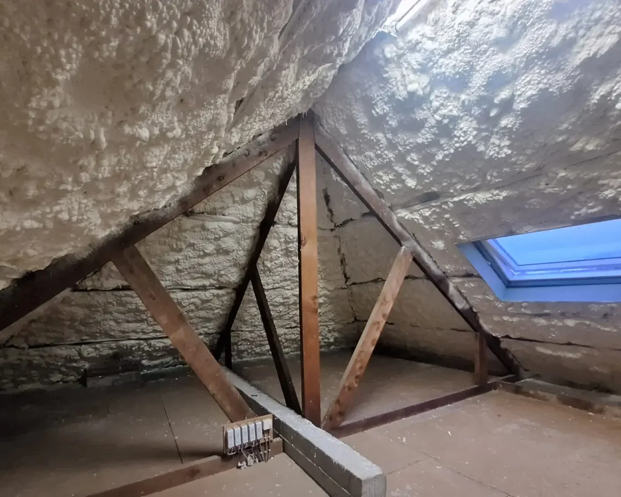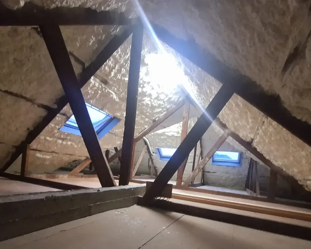 Leur choix s’est porté sur notre expertise car ils recherchaient une solution d’isolation thermique efficace. Rapidement convaincus par les avantages de la mousse à cellules ouvertes ICYNENE LITE+, ils ont opté pour ce matériau. Cette mousse offre une étanchéité à l’air à 100% tout en étant perméable à la vapeur d’eau, ce qui signifie qu’elle « respire » naturellement. Ainsi, il n’est pas nécessaire d’ajouter un pare-vapeur après son application, ce qui en fait une solution à la fois performante et pratique.