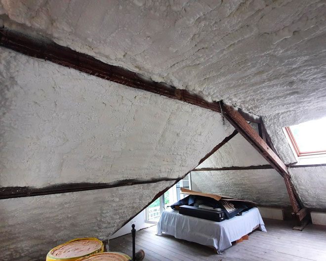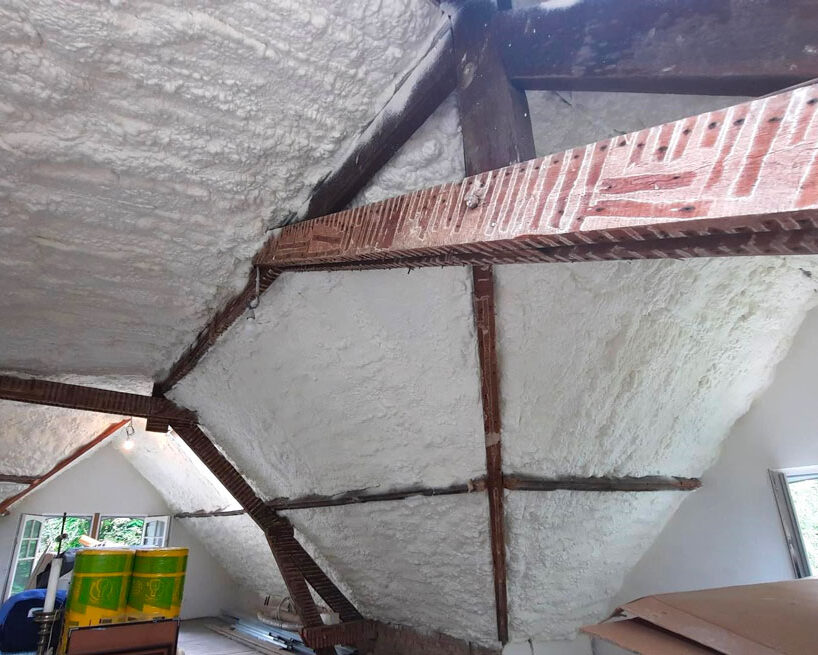 Le projet consistait à isoler une surface de 140 m² de toiture par l’intérieur, avec une épaisseur de 20 cm de mousse. Nous avons choisi la mousse à cellules ouvertes ICYNENE LITE+. Pourquoi ? Principalement en raison de ses performances thermiques de haute qualité et de sa capacité à s’adapter à des structures de toit complexes.